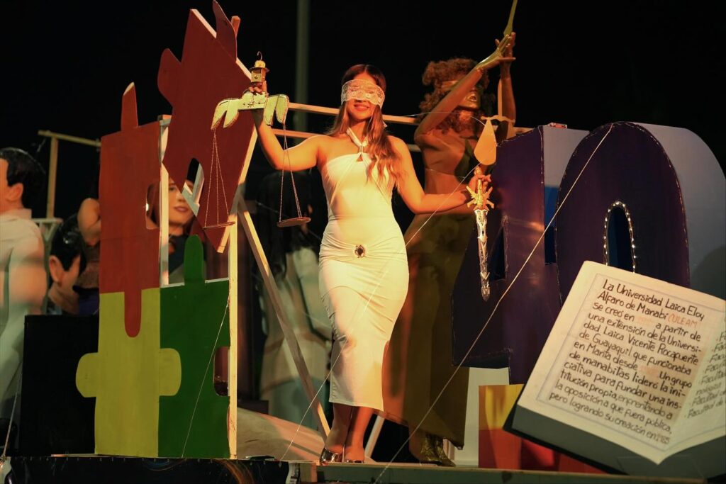 ‎En sí, fueron miles de espectadores que se apostaron a lo largo del trayecto desde el campus universitario, pasando por las calles 12, 13 y 15 hasta llegar a la Plaza Cívica de la Av. Malecón. Ahí estaba la tribuna principal, presidida por Marcos Zambrano, rector de la Uleam, y el jurado calificador que debía escoger a la mejor representación.
